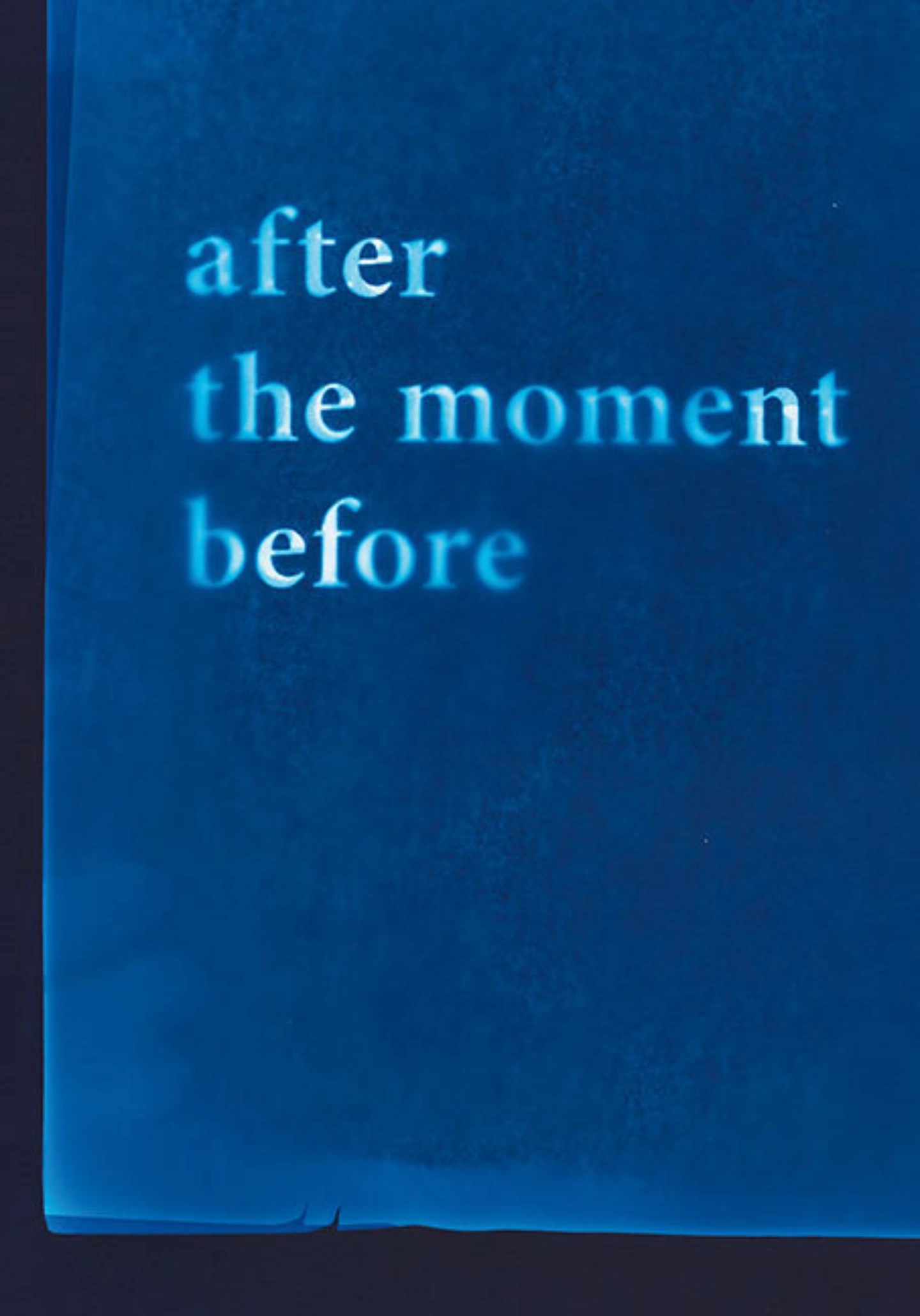 Auf die Spitze getrieben wird Passivität als bildgebende Methode in der Arbeit 2022. Jeden Tag des Jahres hat Anna Vovan ein A4 Papier mit lichtempfindlicher Lösung eingestrichen und für vierundzwanzig Stunden dem Tages- und Nachtlicht ausgesetzt. Die einzelnen Cyanotypien wurden abfotografiert, zu einem Buch gebunden und werden jetzt in der Ausstellung an die Wand des Galerieraums projiziert. Da Vovan darauf verzichtet hat, die Blätter zu fixieren, ist das, was wir sehen, so schon gar nicht mehr vorhanden. 2022 wird bei jedem Durchblättern erneut dem Licht ausgesetzt, überschreibt sich also bei jedem Betrachtungsvorgang immer wieder selbst. So wie das vergangene Jahr niemals ganz beendet sein wird, weil die Vergangenheit in die Gegenwart hineinwirkt, und vice versa. Wie das vegetative Nervensystem arbeitet 2022 von alleine. Man muss sich also keine Sorgen machen: das Herz wird weiter schlagen, Bilder und Formen entstehen von sich aus – wenn man sie nur lässt.